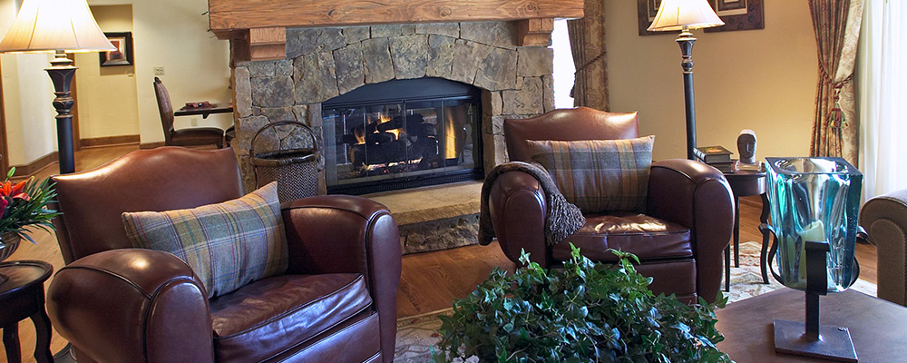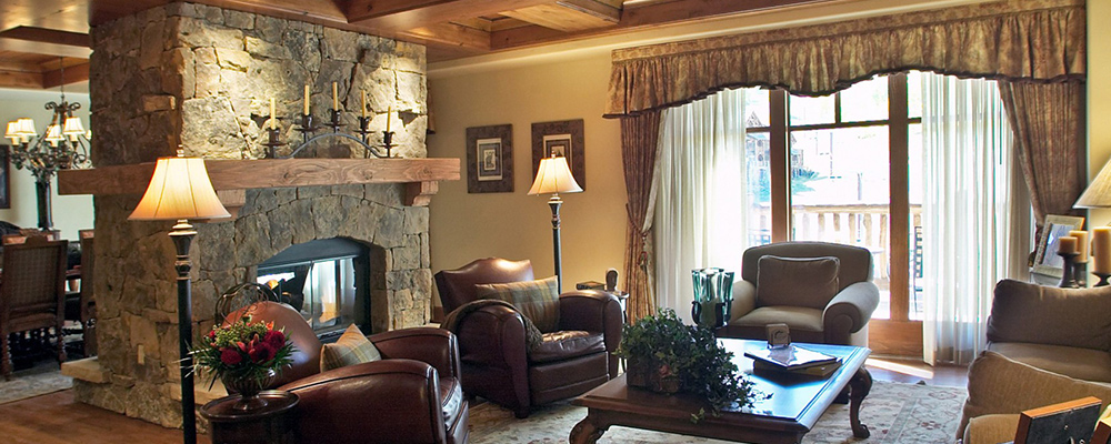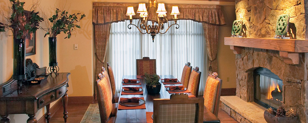 Great Room & Living Area: This penthouse showcases a floor plan that’s just right for family get-togethers. The layout includes a large great room with a two-sided moss rock fireplace at the helm to separate the living and dining areas, plus a sofa and chair configuration to encourage conversation in view of both the mountains and the flickering fire.